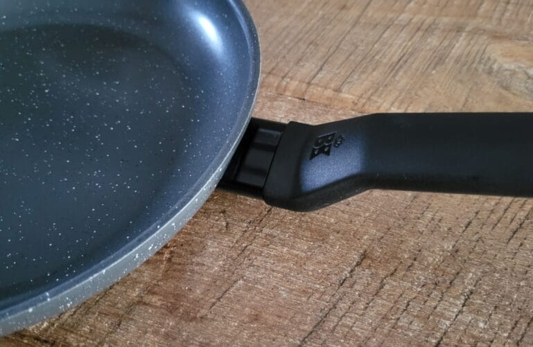 Verder is het uiterlijk ook bijzonder. Je zit in de antiaanbaklaag (die PFAS-vrij is) witte en zwarte stukjes zitten. Dit zien we vaker bij pannen met een keramische antiaanbaklaag en geeft een mooi effect.